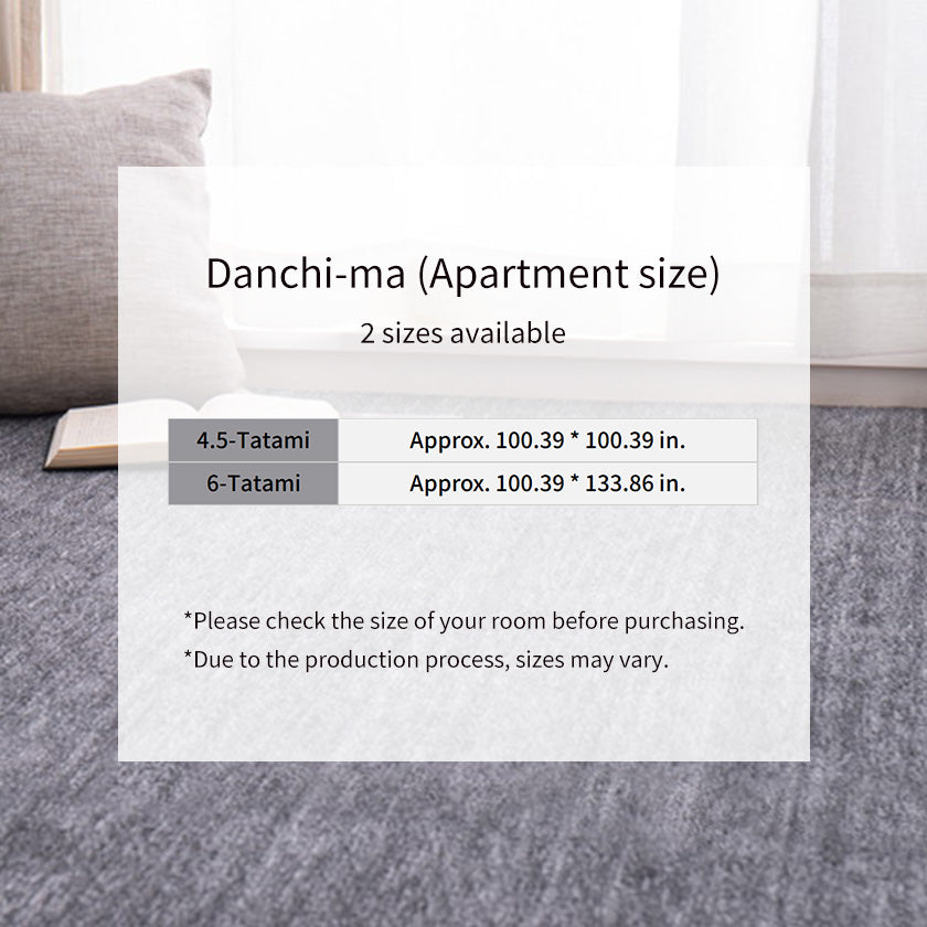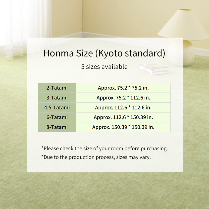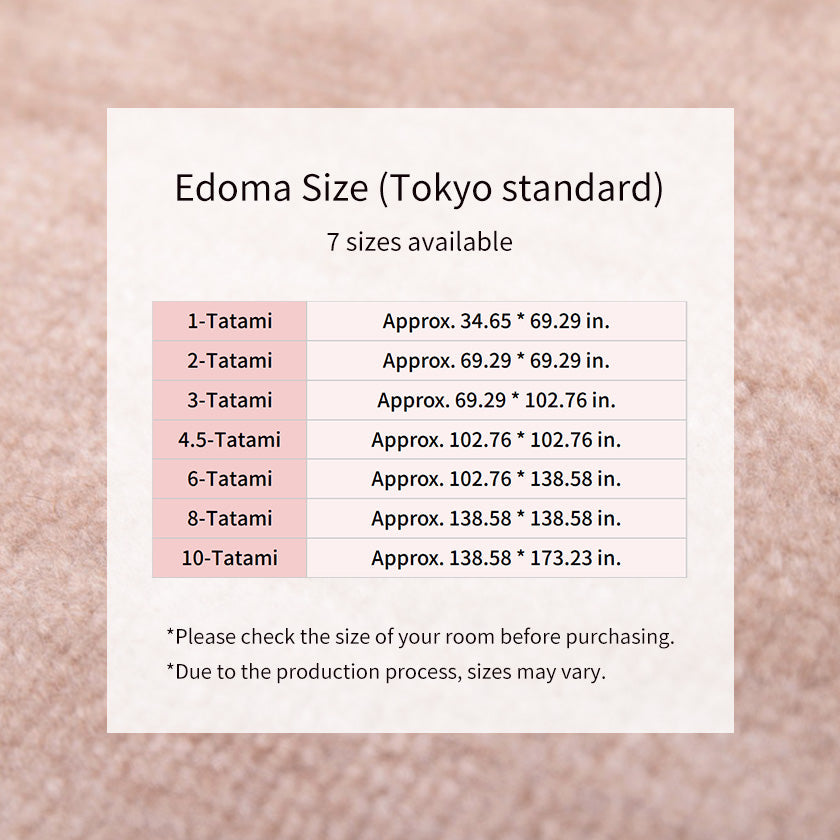 | Size | [Edoma Size (Tokyo standard)] 1-Tatami: W34.65 * L69.29 in. 2-Tatami: W69.29 * L69.29 in. 3-Tatami: W69.29 * L102.76 in. 4.5-Tatami: W102.76 * L102.76 in. 6-Tatami: W102.76 * L138.58 in. 8-Tatami: W138.58 * L138.58 in. 10-Tatami: W138.58 * L173.23 in. [DANCHI-MA (APARTMENT SIZE)] 4.5-Tatami: W100.39 * L100.39 in. 6-Tatami: W100.39 * L133.86 in. [Honma Size (Kyoto standard)] 2-Tatami: W75.2 * L75.2 in. 3-Tatami: W75.2 * L112.6 in. 4.5-Tatami: W112.6 * L112.6 in. 6-Tatami: W112.6 * L150.39 in. 8-Tatami: W150.39 * L150.39 in. ([Edoma Size (Tokyo standard)] 1-Tatami: W88 * L176 2-Tatami: W176 * L176 3-Tatami: W176 * L261 4.5-Tatami: W261 * L261 6-Tatami: W261 * L352 8-Tatami: W352 * L352 10-Tatami: W352 * L440 [DANCHI-MA (APARTMENT SIZE)] 4.5-Tatami: W255 * L255 6-Tatami: W255 * L340 [Honma Size (Kyoto standard)] 2-Tatami: W191 * L191 3-Tatami: W191 * L286 4.5-Tatami: W286 * L286 6-Tatami: W286 * L382 8-Tatami: W382 * L382cm) |