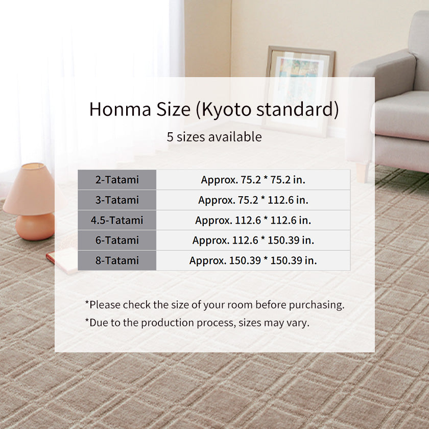 | Size | [Edoma Size (Tokyo standard)] 2-Tatami: W69.29 * L69.29 in. 3-Tatami: W69.29 * L102.76 in. 4.5-Tatami: W102.76 * L102.76 in. 6-Tatami: W102.76 * L138.58 in. 8-Tatami: W138.58 * L138.58 in. 10-Tatami: W138.58 * L173.23 in. [Honma Size (Kyoto standard)] 2-Tatami: W75.2 * L75.2 in. 3-Tatami: W75.2 * L112.6 in. 4.5-Tatami: W112.6 * L112.6 in. 6-Tatami: W112.6 * L150.39 in. 8-Tatami: W150.39 * L150.39 in. ([Edoma Size (Tokyo standard)] 2-Tatami: W176 * L176 3-Tatami: W176 * L261 4.5-Tatami: W261 * L261 6-Tatami: W261 * L352 8-Tatami: W352 * L352 10-Tatami: W352 * L440 [Honma Size (Kyoto standard)] 2-Tatami: W191 * L191 3-Tatami: W191 * L286 4.5-Tatami: W286 * L286 6-Tatami: W286 * L382 8-Tatami: W382 * L382cm) |