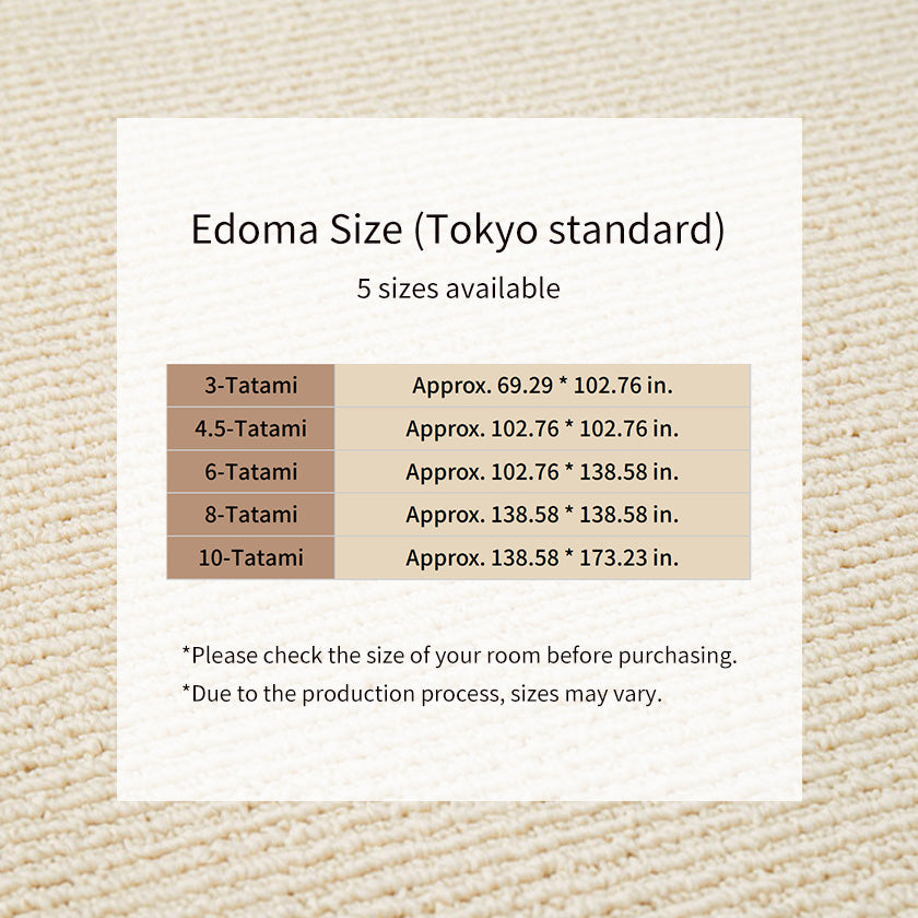 | Size | [Edoma Size (Tokyo standard)] 3-Tatami: W69.29 * L102.76 in. 4.5-Tatami: W102.76 * L102.76 in. 6-Tatami: W102.76 * L138.58 in. 8-Tatami: W138.58 * L138.58 in. 10-Tatami: W138.58 * L173.23 in. ([Edoma Size (Tokyo standard)] 3-Tatami: W176 * L261 4.5-Tatami: W261 * L261 6-Tatami: W261 * L352 8-Tatami: W352 * L352 10-Tatami: W352 * L440cm) |