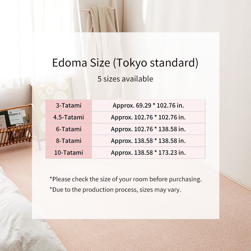 | Size | [Edoma Size (Tokyo standard)] 3-Tatami: W69.29 * L102.76 in. 4.5-Tatami: W102.76 * L102.76 in. 6-Tatami: W102.76 * L138.58 in. 8-Tatami: W138.58 * L138.58 in. 10-Tatami: W138.58 * L173.23 in. ([Edoma Size (Tokyo standard)] 3-Tatami: W176 * L261 4.5-Tatami: W261 * L261 6-Tatami: W261 * L352 8-Tatami: W352 * L352 10-Tatami: W352 * L440cm) |