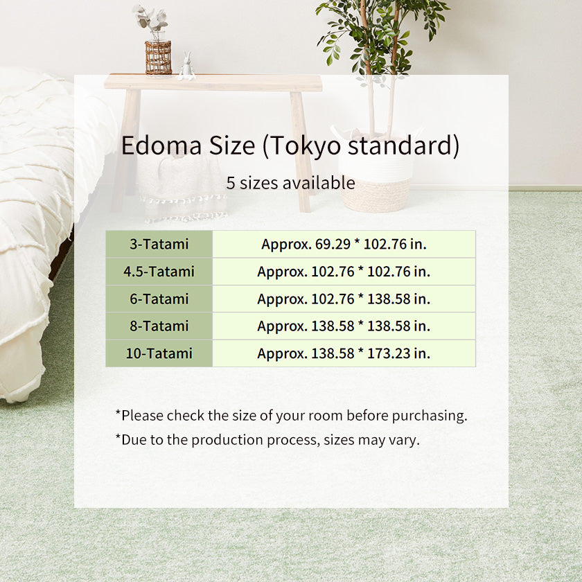 | Size | [Edoma Size (Tokyo standard)] 3-Tatami: W69.29 * L102.76 in. 4.5-Tatami: W102.76 * L102.76 in. 6-Tatami: W102.76 * L138.58 in. 8-Tatami: W138.58 * L138.58 in. 10-Tatami: W138.58 * L173.23 in. ([Edoma Size (Tokyo standard)] 3-Tatami: W176 * L261 4.5-Tatami: W261 * L261 6-Tatami: W261 * L352 8-Tatami: W352 * L352 10-Tatami: W352 * L440cm) |
