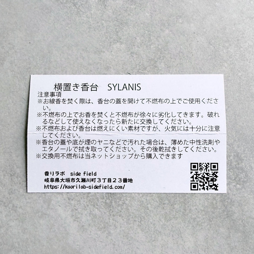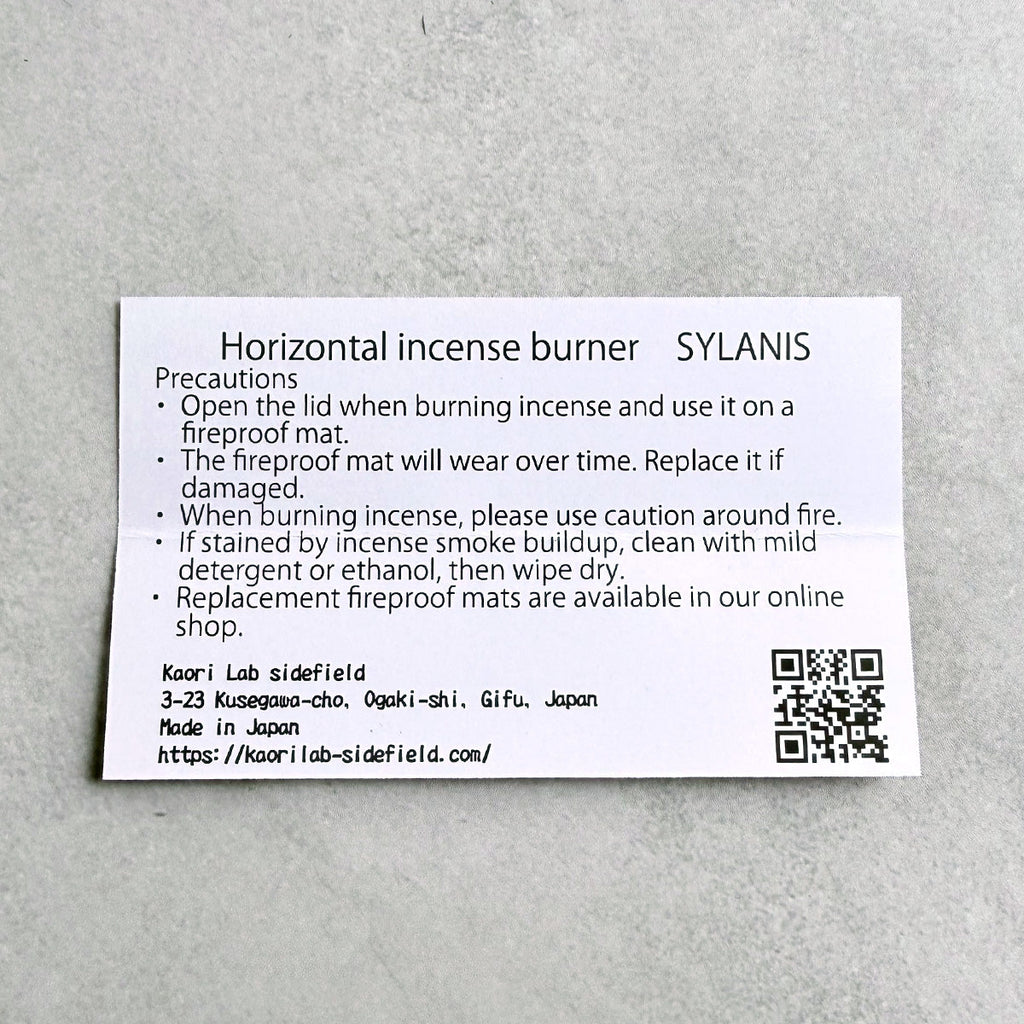 | Note | *When burning incense, open the incense burner lid and use it on top of the non-flammable cloth. *Burning incense on the non-flammable cloth will gradually degrade it. Replace it with a new one if it becomes unusable due to tearing, etc. *Although the non-flammable cloth and incense stand are made of flame-resistant materials, exercise extreme caution around open flames. *If the lid or base of the incense stand becomes soiled with smoke residue, wipe it clean with diluted neutral detergent or ethanol. Then wipe dry. |